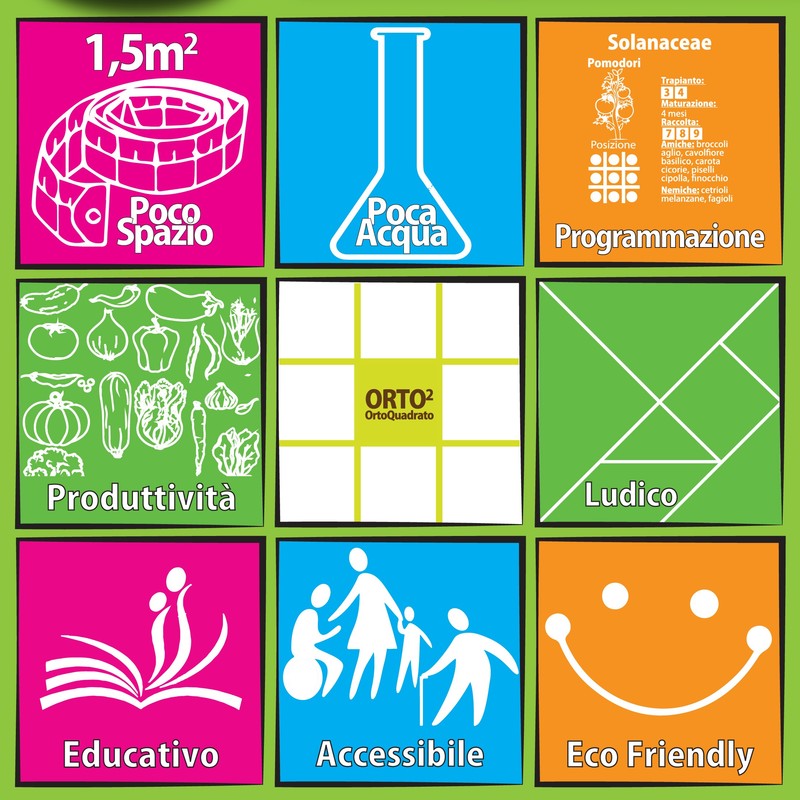 L’Orto Quadrato, infatti, si presta al conseguimento di obiettivi di acquisizione e potenziamento di numerose aree cognitive, come le abilità spazio-temporali, la concentrazione, l’attenzione, la manualità fine e complessa. Consente inoltre di sviluppare il senso prospettico e longitudinale delle azioni, la sequenzialità, il rapporto causa-effetto e la socializzazione. Inoltre, il rapporto con le piante, più spiccatamente individuale e fondato sul protagonismo di ciascuno nella cura, consente di lavorare sulle emozioni, sull'empatia e sull'emersione di stati emotivi e affettivi complessi, positivi come più critici. I principi fondamentali di questo metodo sono estremamente semplici. Si tratta di realizzare un orto sollevato in un contenitore quadrato di legno diviso in 9 quadrati che producono fino a 9 ortaggi diversi su una superficie totale di circa 1,5 mq compresi gli spazi per girarci attorno. L'Orto Quadrato permette di condensare lo spazio dedicato all'orto e, a parità di risultati, ridurre notevolmente le sue dimensioni, contenendo così proporzionalmente il consumo di terra ed acqua limitando molto il lavoro necessario alla sua realizzazione e mantenimento.