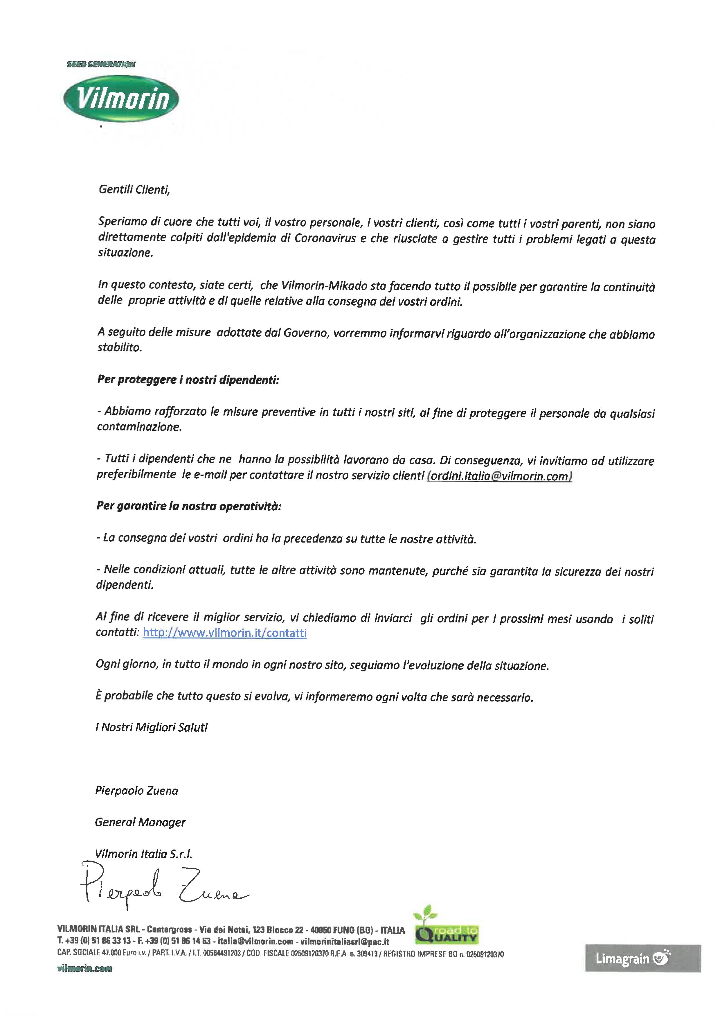 - Tutti i dipendenti che ne hanno la possibilità lavorano da casa. Di conseguenza, vi invitiamo ad utilizzare preferibilmente le e-mail per contattare il nostro servizio clienti (ordini.italia@vilmorin.com)